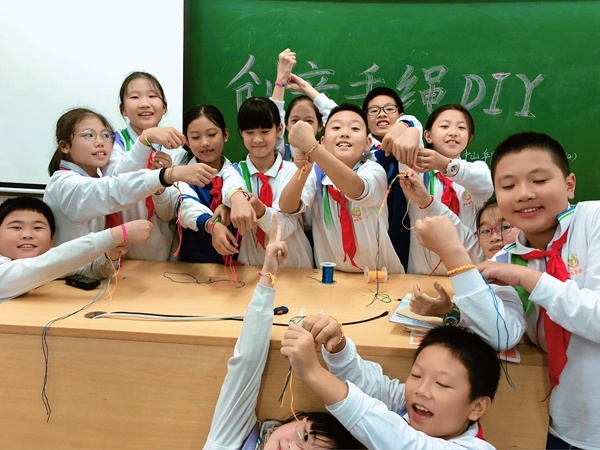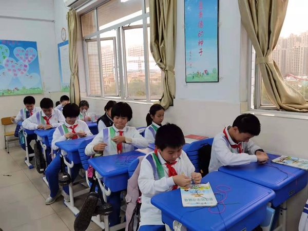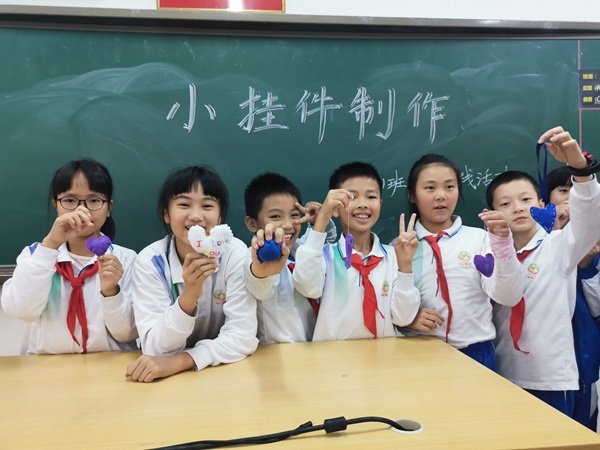 制作的過程中,同學(xué)們手腳麻利,不論是柔軟的彩繩還是七彩的卡紙,使用起來都得心應(yīng)手,動手能力令人驚嘆。偶爾還有構(gòu)思巧妙的作品產(chǎn)生,引得教室里歡笑一片。經(jīng)過十幾分鐘的精耕細(xì)作,作品新鮮出爐。二年級五彩的紙扇,映著同學(xué)們燦爛的笑容;一年級同學(xué)的小魚仿佛要在他們的手中游弋;三年級同學(xué)的紙鶴捧在掌心,視若珍寶。四五年級的同學(xué)則早已把精心制作的手鏈和掛件戴在了身邊,愛不釋手,喜不自勝。