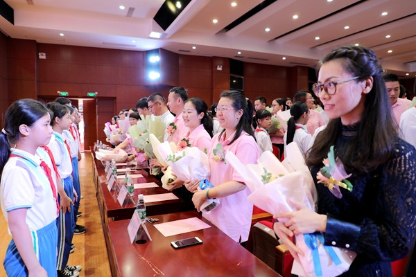 典禮在畢業生表演的詩朗誦《畢業之歌》中拉開了序幕。學生們精神飽滿,隨著舒緩的音樂,深情款款,道出了對老師的感恩,對母校的眷戀,對同學的不舍。為了表達對老師們的感謝,同學們給全體六年級老師獻上鮮花與祝福,全體學生齊聲高喊“老師謝謝您,老師您辛苦了”。飽含深情的聲音回蕩在大禮堂,寄托了孩子們對老師的感恩和不舍。