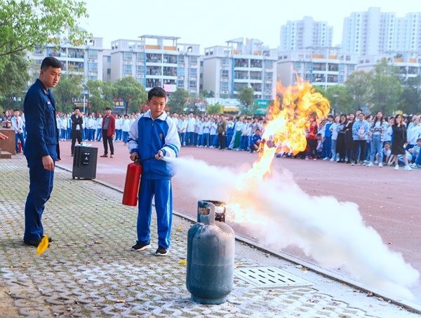 最后,在消防員的指導下,同學們學習了滅火器材的使用方法。各班學生代表親身體驗了滅火過程,做到敢用、會用滅火器。