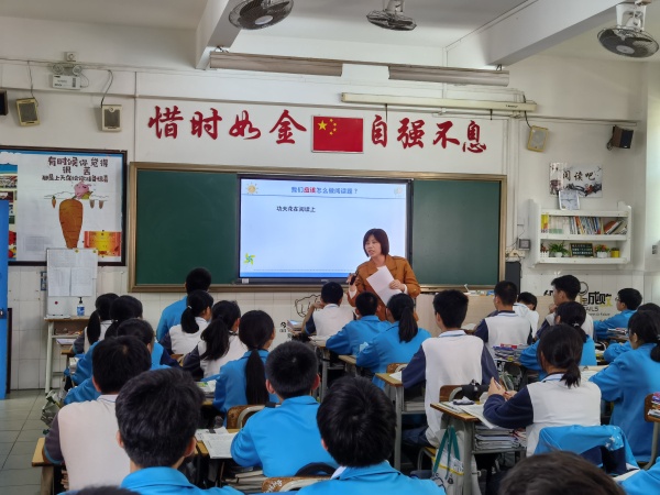 活動分兩個階段:第一階段隨堂聽課。中山市教育教學(xué)研究室語文教研員郭躍輝深入課堂聽課,大南中學(xué)初三年級語文老師宋穎上了一節(jié)“文學(xué)類文本閱讀”復(fù)習(xí)課。宋穎老師通過給學(xué)生閱讀支點的方法,引導(dǎo)學(xué)生深入閱讀文本,熟悉考點,幫助學(xué)生提高閱讀備考效率。