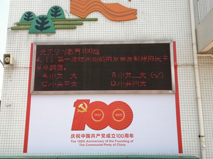 為營造濃厚的學(xué)習(xí)氛圍,學(xué)校進(jìn)行“黨在我心中”宣傳,每天都會(huì)在LED屏顯示一題黨史知識(shí)。通過這樣的形式,讓全體師生每天都學(xué)習(xí)黨史,了解黨史,感受黨發(fā)展光輝歷程。
