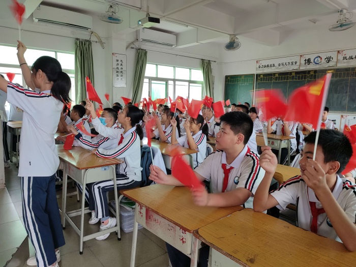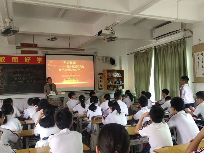 初一年級各班主任也開展了《黨旗飄飄》主題班會。初一(10)班郭欽洲老師結合黨史并結合學生實際,每位同學派發一面國旗和黨旗,詳細講解了黨旗的知識和在中國共產黨領導下的偉大事件,同學們手搖黨旗、國旗,在合唱革命歌曲中感受革命精神,最后同學們在黨旗和國旗下宣誓:成長于港口中學這片熱土,聆聽恩師們的教誨,感受父母的恩情,心懷報效祖國之志,要為共產主義事業添磚加瓦。