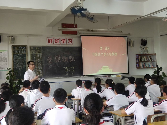 早上第一節,港口中學黨支部書記廖志堅深入學生當中,來到初一(6)班為少先隊員開展了主題為《黨旗飄飄——我為黨旗添光彩》黨史教育主題班會,廖書記從一段小視頻導入,為同學們娓娓道來黨史百年中的重大歷史事件,繪聲繪色地講述英雄事跡,同學們表示要傳承紅色基因,在這最好的時代刻苦勤奮學習,實現新突破、展現新自我,為實現中華民族偉大復興的中國夢而努力讀書。