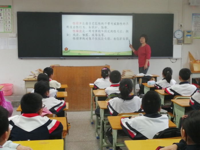 課前,各年級組結合本年級學生的實際,精心備課,并制作了精美且實用的課件輔助教學。課中,低年級教師以小精靈童話形式引導孩子明白要保護好自己的隱私部位,了解與性安全相關的自我保護知識,懂得保護自我權利。中年級教師讓孩子觀看視頻《我是一個小美麗》片段,揭示主題《我們的身體不容侵犯》。邀請學生上臺扮演加害人和被害人,認識遇到性騷擾和性侵犯怎么辦,教師適時做出引導,學生們暢談收獲。高年級教師以游戲導入,教會孩子看到父母吵架時應如何宣泄感受。教師鼓勵學生與父母溝通,播放《小孩不笨》片段,展開小組討論,學生們紛紛總結釋放自己情感的方法,同時,教師也通過實例,教會學生充當家長的和平使者。