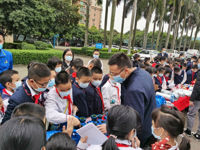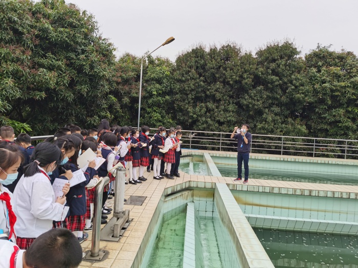 下午兩點半,四年級學生已經排著整齊的隊伍出發古鎮供水廠。一來到水廠,各位工作人員對同學們的到來表示熱烈歡迎。他們先對古鎮供水廠作了簡單介紹;接著,同學們在工作人員的帶領下參觀了供水廠的沉淀池、過濾池、清水池等不同地方;同時,水廠工作人員也詳細地為同學們講解了原水是怎樣經過混合、反應絮凝、沉淀、過濾、消毒等環節,才變成我們家家戶戶所用的干凈、健康的自來水。同學們都聽得非常認真,還不時禮貌地請教工作人員各種關于自來水凈化工藝流程的問題,并做好筆記。同學們還認真地觀看了工作人員進行余氧檢測的操作,了解了如何通過微生物實驗以及滴定實驗來測定水的潔凈程度,深切體驗了自來水生產過程的科學性與嚴謹性。