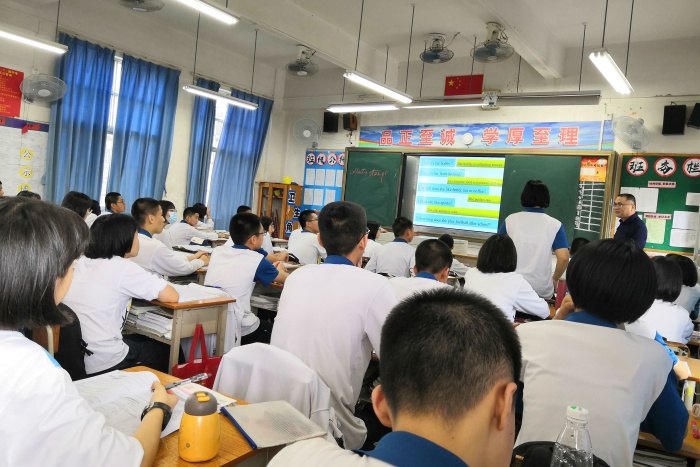 教研活動以年四揚校長在初三(1)班的一節別開生面的英語中考備考示范課為開端。課堂上,年校長以個人興趣愛好為話題,設計了聽錄音回答問題、情景對話、寫作等學習任務,通過頭腦風暴的方式,對相關的話題詞匯進行梳理,幫助學生形成語義網絡。充分調用“聽、說、讀、寫”各種語言技能,并通過聽和說的語言運用過程,達到對語言知識的梳理和鞏固。此外,年校長在寫作任務設計時還提供一些核心詞匯和目標語言以便學生能更自如地表達。一節課下來,學生有討論,有展示,有寫作,動靜結合,利用小組合作學習,學生的積極性與參與度高。年校長這節示范課,給初三備課組的老師指引了備考的方向,也受到了英語科組全體老師的一致好評。
