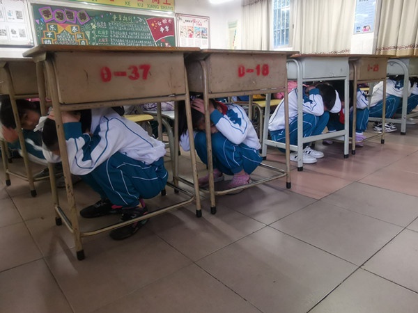 2021年3月23日上午8點50分,校園內響起了急促的地震預警信號。正在上課的師生聽到地震警報聲后,迅速作出反應,學生在老師的指導下,迅速蹲到堅固的桌子底下,彎腰,用雙手保護頭部。大概1分鐘后,地震警報解除。