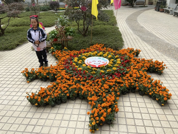 看,這是二(1)班“花香四季,無與‘輪’比”花卉展區(qū),他們班的花卉展區(qū)是用廢舊輪子改裝而成,變廢為寶,綠色環(huán)保。展區(qū)的整體造型是一只章魚,章魚的觸手緊握著五彩繽紛的五盤花,寓意“德育之花、智育之花、體育之花、美育之花、勞育之花”;看,那是六(1)班“繁花似錦,與美相伴”花卉展區(qū),他們班的展區(qū)造型主要由兩部分組成:最中間部分是由雞冠花組成的“美”字,代表了六(1)班的班名——尚美班,也代表著同學(xué)們要與美相伴,做美人做美事,堅持以美立人。外面則是由鮮嫩的綠色組成,充滿著生機(jī)與活力,也象征著同學(xué)們的朝氣蓬勃,積極向上……每個展區(qū)前都圍滿了人,大家開心地欣賞著美麗的奇花異草,盡情地遨游于三沙小學(xué)的花海世界。