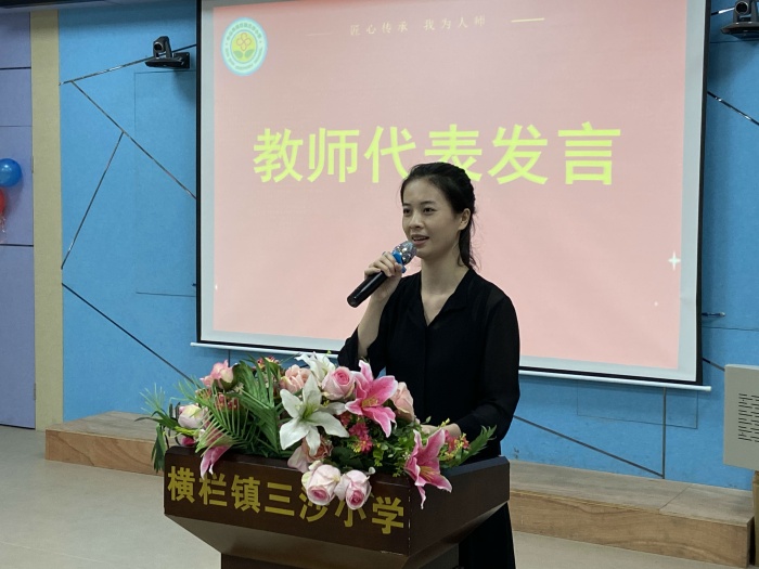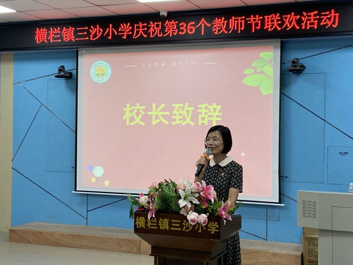 隨后,三沙小學馮紅燕校長上臺致辭。馮校長在致辭中代表學校祝全體教師節日快樂,向在百忙中親臨學校送來節日問候的領導們表示熱烈的歡迎和衷心的感謝,向一直以來對學校工作鼎力支持的三沙村委表示感謝,并要求三沙小學全體教師要認真按鎮黨委馮金怡書記的囑托,努力在以下幾個方面做得更好:要堅守教師的道德與情操,做學生美好靈魂的塑造者;要胸懷教育的責任與追求,做傳道授業解惑的引路人;要鉆研教學的理念和方法,做改革發展創新的踐行者。
