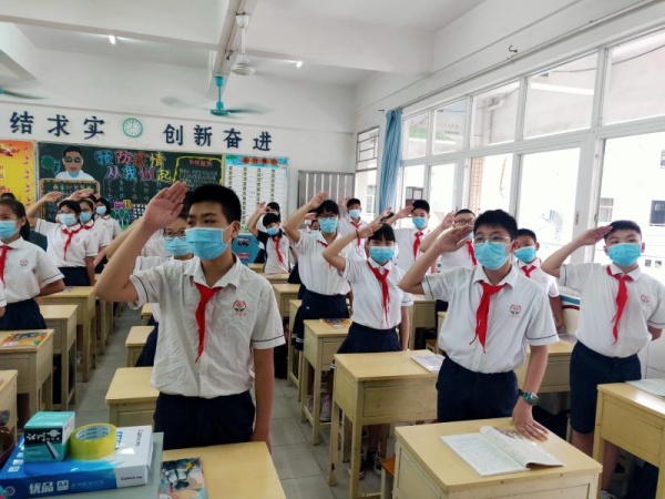 上午八點(diǎn),開學(xué)典禮準(zhǔn)時(shí)開始。首先進(jìn)行莊嚴(yán)的升旗儀式,師生集體肅立在教室里,面向大屏幕注視著飄揚(yáng)的國旗,唱響嘹亮的國歌。