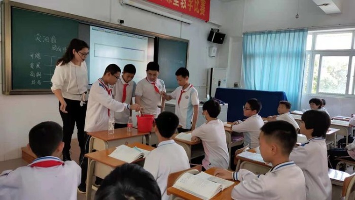 羅秀嫻老師率先登場,她以“吹糖人”等中國傳統手工藝品的視頻引入課題,同時還結合文中人物的身份特征準備了各式各樣的“小道具”,引導學生角色扮演,整堂課氣氛活躍,趣味橫生。