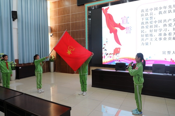 伴隨著嘹亮的出隊旗曲,旗手和護旗手們邁著整齊、鏗鏘有力的步伐出場。緊接著,全體隊員起立,高唱隊歌,新隊員們精神飽滿,歌聲洪亮,唱出了心中的自豪和對少先隊組織的無比熱愛。少先隊大隊長王敏喬同學宣讀完新隊員名單后,六年級優秀少先隊員代表為新隊員戴上了鮮艷的紅領巾。戴上紅領巾的新隊員們個個精神抖擻,臉上洋溢著幸福和自豪的笑容。在副大隊長趙梓默的帶領下,新隊員們在隊旗下莊嚴宣誓,老隊員重溫入隊誓詞。宣誓結束后,少先隊總輔導員杜沁源老師講話,她對新隊員們加入少先隊組織表示祝賀并提出了殷切的希望,希望新隊員們在星星火炬旗幟的指引下,踏著先輩的足跡,以嚴格的標準規范自己的行為,努力學習,勇敢前進,學會感恩,珍惜生命,牢記自己的光榮使命。最后,全體隊員在杜老師的帶領下齊聲呼號。