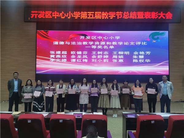 活動伊始,教導處主任劉愛紅從“三個感謝、兩條主線、一個目標”三個模塊共五個方面對本屆教學節進行了全方位的回顧與總結。劉主任滿懷激情地對在本屆教學節期間踴躍報名參賽的教師給予了中肯的贊譽,極大地鼓舞了現場在座老師。隨后舉行了隆重的頒獎儀式。劉剛毅校長、楊異偉副校長分別為在道德與法治教學資源和教學論文獲得一等獎的教師頒發獎狀并合影留念。