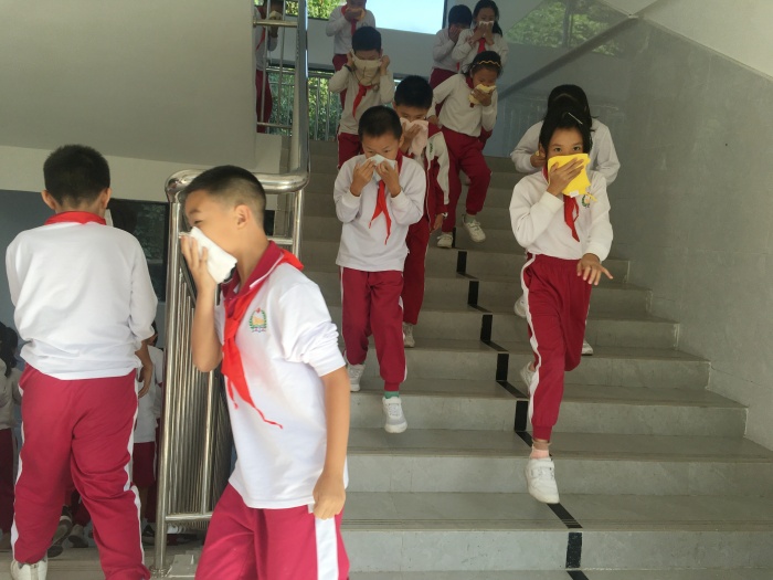 為了實施好這次演練,學校制定了詳細的消防疏散演練方案,對各班逃離的路線及安全出口老師的職責等內容都做了明確的規定。演練開始前,各班級預先進行了演習布置工作,班主任對學生做了詳盡的演習講解。16:00隨著警報的響起,各班主任老師迅速組織學生疏散,其他老師們也在第一時間趕到自己當時所在樓層拐角處配合疏散學生。學生在老師們的指揮下,按照演練方案中規定的路線,彎著腰,貓著步,用毛巾捂住口鼻,沿著學校指定樓梯口快速前進,有序撤離到學校操場的安全地帶集合。經計時,從警報響起到全體師生從課室疏散、集合完畢,共計用時不到2分鐘。