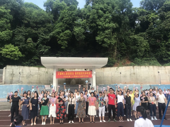 9月10日是第36個教師節。為持續實施“奮進之筆”的進展成效,展示廣大教師立足教育教學崗位,助力打贏新冠肺炎疫情防控阻擊戰、教育脫貧攻堅戰的精神風貌。當天早上,開發區第二小學全體師生齊聚學校操場舉行以“立德樹人奮進擔當 教育脫貧托舉希望”為主題的慶祝教師節活動。
