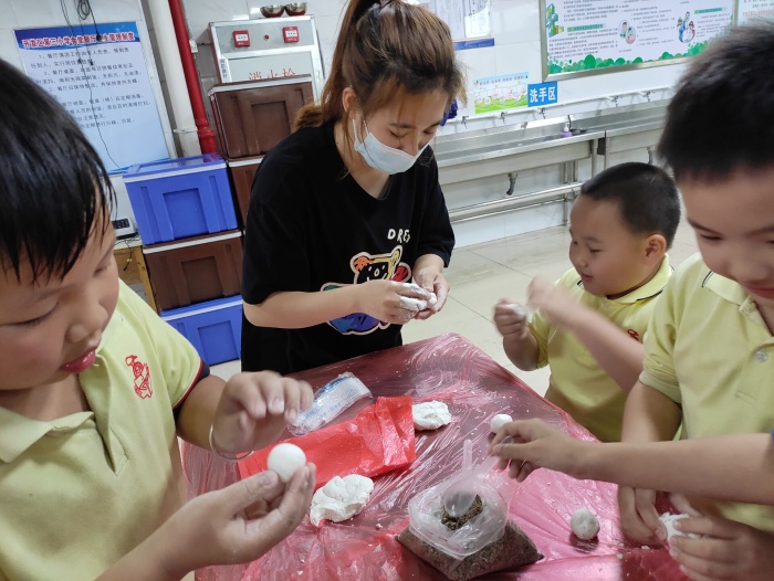 首先,孩子們洗干凈雙手,挽起衣袖,有模有樣的學著爸爸媽媽的樣子包起湯圓:先拿和好的糯米粉團揪一小團,糯米面,讓孩子們擠壓成圓片形狀,再挑一團餡放在糯米片上,最后用雙手轉邊收口做成一個小圓球??粗粋€個圓溜溜的湯圓真可愛!緊接著,煮湯圓時,先燒開水,把湯圓慢慢放入鍋內,輕輕的攪開,湯圓浮出水面代表已經煮熟?;顒幼詈?,家長伴著《賣湯圓》的優美旋律和孩子們一起品嘗著自己的勞動成果,每個人的臉上都洋溢著過節的喜慶。