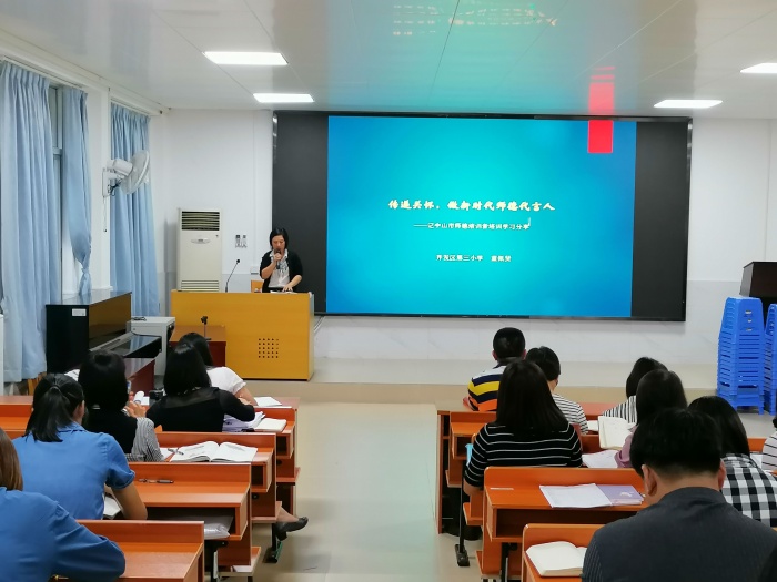 分享會由德育主任藍佩賢主持,藍主任先分享在中山市師德培訓者培訓學習的感想,從師德的新挑戰出發,同時引導大家從學生的發展、社會的需要的角度思考到底我們需要怎樣的老師,再從分享教育小故事,引導大家要做一個有溫度的老師,傳遞關懷,新時代師德代言人。