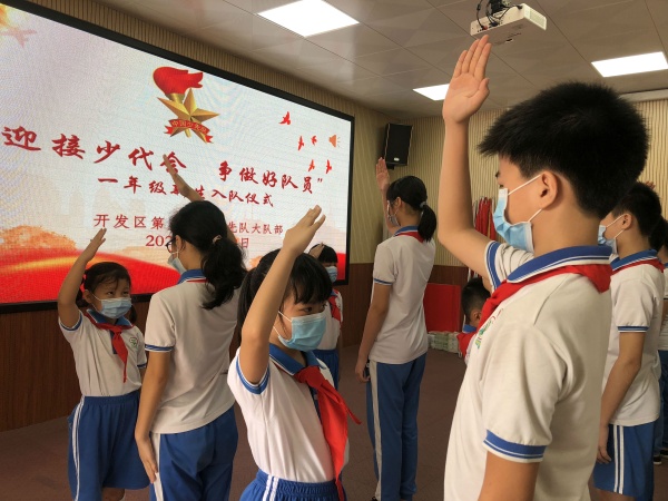 5月29日上午9:00,開發區第五小學少工委為一年級預備隊員舉行了主題為“迎接少代會 爭當好隊員”的入隊儀式。入隊儀式在充滿朝氣和活力的《中國少年先鋒隊隊歌》的歌聲中拉開儀式的帷幕。大隊長李顏汐宣讀了新隊員入隊名單,六(1)中隊的隊員們為50位新隊員佩戴上鮮艷的紅領巾。在總輔導員阮結連老師的帶領下,新隊員在隊旗下莊嚴宣誓,正式成為中國少年先鋒隊的一員。