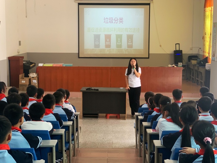 在課堂上,社工與同學們熱情互動,通過知識搶答、趣味小游戲等,進一步增強了同學們垃圾分類的意識和保護環境的責任心。
