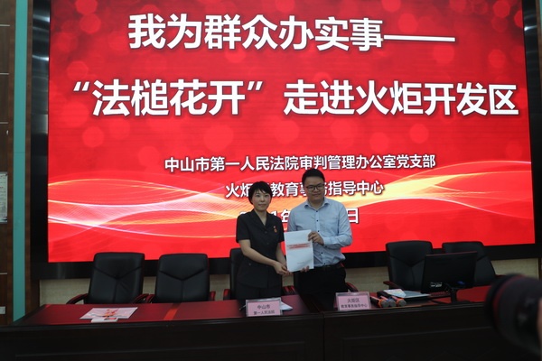 活動首先進行“法槌花開”簽約及火炬區“紅領巾”實踐基地授牌儀式,在全體與會人員的共同見證下,中山市第一法院審判管理辦公室負責人丁向娜與火炬開發區德育專干謝藝波上臺現場簽約,謝藝波代表火炬開發區教育事務指導中心向中山市第一人民法院授予“火炬區紅領巾文明實踐基地”牌匾。丁向娜表示,中山市第一人民法院開展“法槌花開”系列普法活動,旨在以法院現場研學、與法官面對面交流、法律知識問答、模擬法庭、法官體驗等豐富形式,達到以真實體驗潤物無聲的普法效果,歡迎各學校組織學生到法院開展相關活動,進一步提高學生法律和自我防范意識。