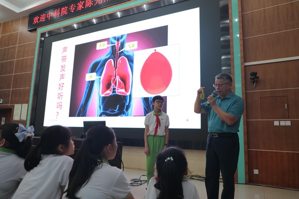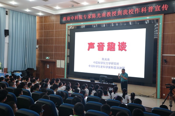 本次活動由中國科學院專家陳光南教授主講,陳教授針對五年級學生的認知水平選取了《聲音趣談》這一主題,以交流互動的形式,讓學生在愉悅的氛圍中獲得了與聲音有關的科普知識。