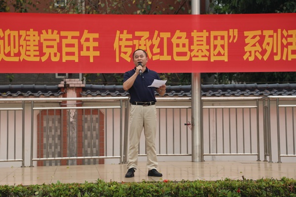 活動伊始,操場上奏響出旗曲,十位升旗隊的同學(xué)踏著矯健的步伐,以飽滿的熱情護衛(wèi)五星紅旗進場。莊嚴雄壯的《義勇軍進行曲》隨后響起,鮮艷的五星紅旗冉冉升起,臺下師生分別行注目禮和少先隊隊禮。簡單而莊重的升旗儀式后,香暉園小學(xué)黨支部委員、副校長劉裕上臺講話。劉副校長在講話中指出,歷史是一面鏡子,它照進現(xiàn)實,也照亮未來,學(xué)習(xí)黨的歷史,了解過去,才能看清前進的方向,他以“少年強則國強”鼓勵全體少先隊員,勉勵他們作為祖國的未來和民族的希望,學(xué)黨史,感黨恩,聽黨話,跟黨走,牢固樹立社會主義核心價值觀,在學(xué)習(xí)和生活中傳承紅色基因,努力成長為德智體美勞全面發(fā)展的社會主義建設(shè)者和接班人。講話結(jié)束后,劉副校長宣布香暉園小學(xué)“喜迎建黨百年 傳承紅色基因”系列活動暨黨史學(xué)習(xí)教育啟動。