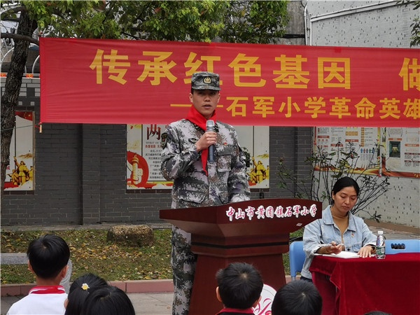 接著,五(1)班岑永詩同學代表學校給梁浩元同志獻上一束鮮花,感謝他這些年來保家衛國。
