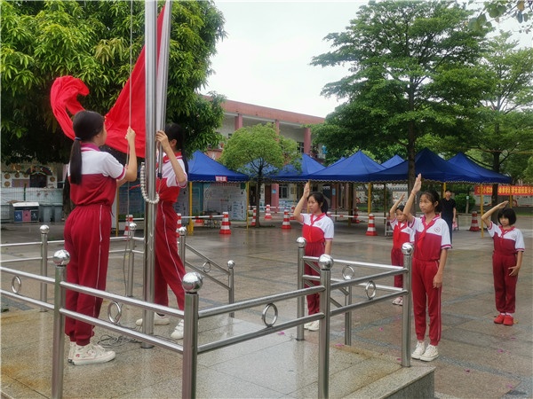 聽著升旗手整齊的踏步聲,隨著洪亮的國歌伴奏,石軍小學全體師生莊嚴肅穆,注視著五星紅旗緩緩升起,唱起國歌,響遍校園。的確,就是因為有祖國才有此時此刻平和、朝氣的校園。