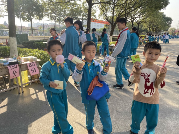 為了這次活動的順利開展,楊嵐副校長特別召集了各班的負責人開會進行了分工。積分兌換時物品的擺放,收點積分卡都由學生們自己來完成。精致的文具,新穎的玩具,可愛的小盆栽、小擺件……孩子們三五成群,小魚兒似的穿梭在各個攤位前,用積分卡換購自己心儀的獎品,享受著收獲的喜悅。拋圈攤位前更是人潮涌涌,同學們排起了長龍,沉浸在游戲的快樂中。這次活動的開展,進一步激勵了學生進行品行儲蓄的積極性,也為孩子們提供了一次鍛煉和實踐的機會。有的同學說:“靠自己的努力掙來的道德積分使自己很有成就感。”有的同學說:“在積累道德積分的過程中學到了很多,感覺自己長大了。”