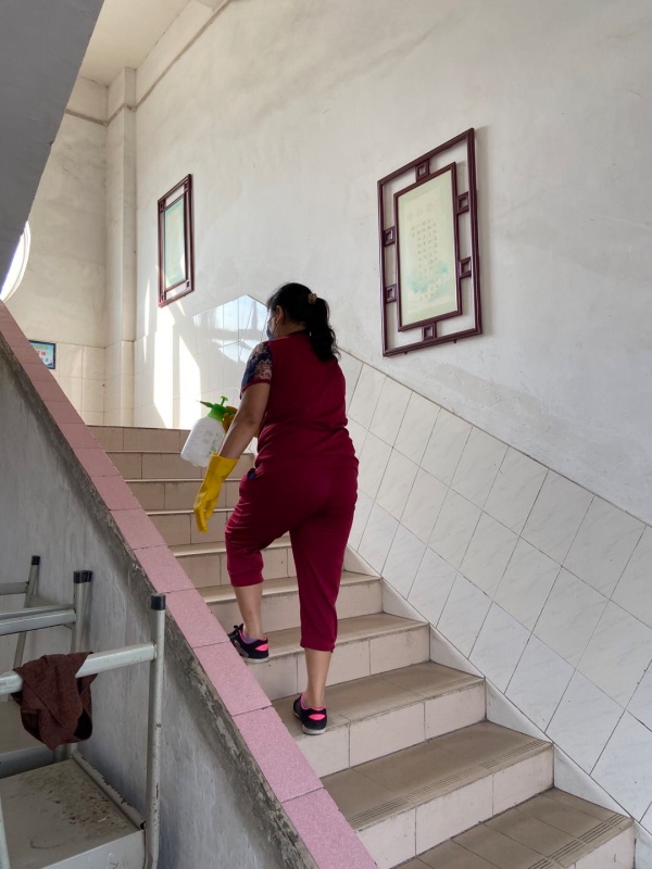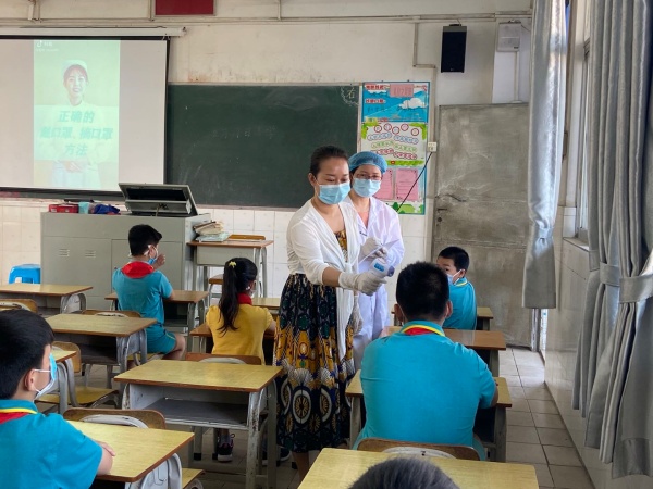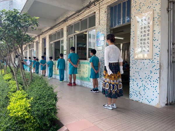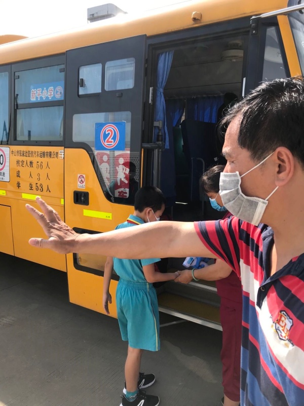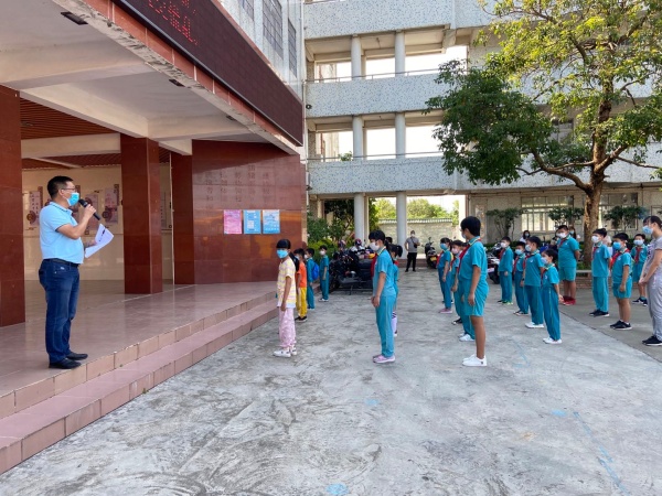 下午3點,演練正式開始,陸銳勛校長為本次演練的總指揮;本次演練分為7個演練內容,第一:早上乘校車演練;乘車學生戴好口罩,學生之間前后保持1米距離排隊候車,校車跟車員按順序為學生測溫,體溫正常(低于37.3度)才允許乘車。第二:師生進校演練;師生佩戴好口罩,有序地排隊,然后依次測溫進校。第三:師生課間管理及體育課演練;下課后,學生一律在教室內各自座位上休息,不能走動(上洗手間除外)。上體育課時,學生帶好口罩,體育老師到班組織學生按1米距離集隊和列隊到運動場。上課期間,學生不用戴口罩,一切活動要保持一定距離,不能出現聚集。第四:食堂就餐演練;上午放學后,當班老師組織本班學生排好隊戴好口罩向食堂出發,原則上按低年級到高年級順序安排領餐餐,學生進入飯堂后,按指引取餐,取餐后回到各自的教室座位就餐。第五:午間測溫演練;各班班主任手持測溫槍,對學生逐一學生測溫,跟班老師負責記錄。第六:下午乘校車演練;學生戴好口罩,保持距離從各班到飯堂前面按各人指定編號站點集隊,集隊時不允許交談。集隊完畢后,由校車管理員、校車值日老師和值班行政帶學生到校車停泊點上車,學生在行走過程要保持1米距離。第七:放學演練;采取分年級錯時放學,全校先在班級進行衛生安全教育,然后由當班老師組織本班學生戴好口罩,在教室外按照安全距離排好隊伍,帶領學生到指定的區域等候(途中教育學生保持距離,不能牽手)。最后是消毒演練;每節課學生上課后及放學后,保潔員用噴壺或噴霧器開展對學校的樓道、走廊、護欄、洗手間進行消毒。
