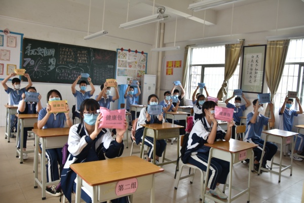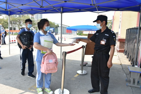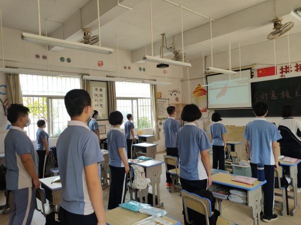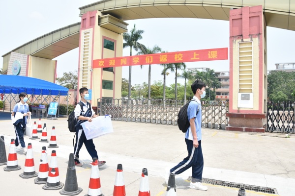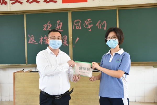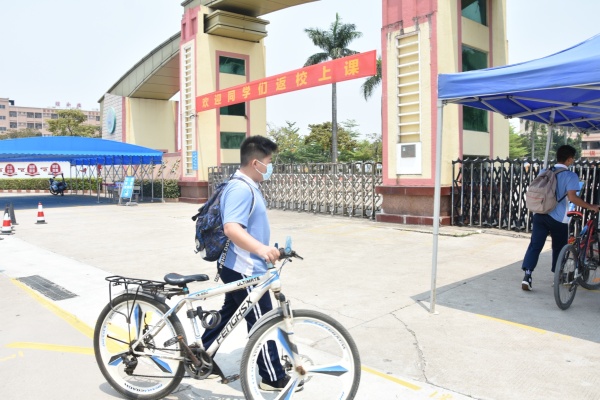 在校門口,有乘坐校車學生及騎自行車的走讀生錯峰陸續抵達校門口,學生們都能自覺佩戴口罩,保持一米以上的距離有序排隊,依次進入體溫監測區域,沒有出現聚集的現象。進入校園后,學生們通過教室專用通道進入教室后,整齊地坐在教室內進行復學第一課的學習。”復學第一課“由中山市第一中學任山鵬老師擔任主講。以“天使歸來,英雄開講”為主題,邀請中山市第四批援鄂醫療隊隊長、中山市人民醫院ECMO研究室副主任廖小卒;中山市第二批援鄂醫療隊成員、中山市中醫院呼吸科醫師傅進藝等醫護人員,現場講述中山醫療隊馳援湖北的驚心動魄的經歷。通過中山援鄂抗疫英雄的親身講述,班主任帶領學生回顧醫護人員及全國人民與新型冠狀病毒艱苦斗爭的歷程,從中理解英雄的含義,培養學生崇敬英雄、學習英雄、捍衛英雄、關愛英雄的情感,進而感悟國家的強大、人民的團結。同時,通過介紹醫護人員精湛的醫術,引導學生明白刻苦學習是奉獻社會的重要基礎,從而增強學生的社會責任感。”復學第一課“結束后,學校還組織初三學生進行了防疫實操演練,包括洗手、用餐等。此外,在復學的第一天,每一位返校的初三學子都收到了一個特殊而又溫暖的禮物——健康包,這是由中山市民眾鎮政府贈送給學生的,希望它能給同學們帶來平安與健康。