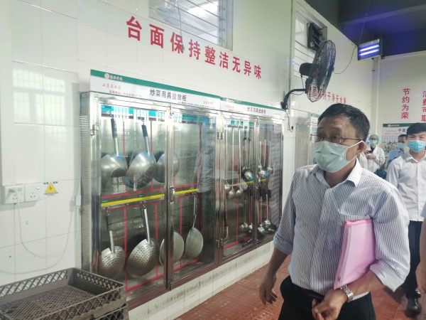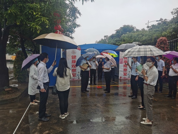 當天,德恒校園里流連春光,舍不得凋零的幾支紫荊花被南國的驟雨擊落一地,落英繽紛,美麗極了。下午2:00,德恒學校全體行政滿懷信心在校門口列隊迎接市高三、初三復學防控工作專班的到來。2:30左右,市教育工委廖誠副書記帶領的驗收專班,在民眾鎮黨委劉釗妍委員和民眾鎮教指中心黃海文主任的引領下,來到德恒學校。一行人在學校門口測完體溫和進行必要消毒后,隨即開始了對德恒學校高三、初三復學防控準備工作的實地查驗。驗收專班一行人首先來到學校健康觀察室,查看了觀察室的防疫物質配備,檢查了消毒通風情況。接著來到學生宿舍,看到德恒學校學生宿舍干凈整潔,通風良好,了解了學校初三、高三學生全部寄宿,每間宿舍只安排三名學生等情況。隨后查看了食堂操作間和學生餐廳,他們不僅對食堂的整潔規范給予了高度評價,還特別對學校安排班主任和行政陪同就餐管理學生的這個細節提出了贊賞。再接著一行人查看了學校保健室、防疫物資儲備室、教室。最后,就地在備用教室召開了反饋會。在會議中,廖書記說,他幾年前來過此地,但當時還不叫德恒學校,今天再到這里,他對德恒兆業教育集團接收這所學校后帶來的巨大變化感到驚喜和意外。他同時強調,德恒學校這次高三、初三復學防控準備工作完成得非常好,要學校及時總結做法和經驗,并將其推廣到后續其他年級的復學防控準備工作中,甚至要在民眾鎮乃至中山市加以推廣,并最后激勵德恒全體行政要再接再厲。