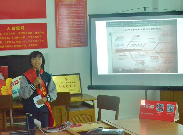 活動的第二項由紅領巾宣講員為大家分享中山縣首任團委書記劉廣生的故事。每一個宣講員都聲情并茂地分別向大家介紹了“擇師運動”“賣蔗埔起義”“秋收暴動”。在宣講過程中少先隊員們深刻感受到今天的生活是先輩們用他們的智慧和心血創造的,要珍惜今天的幸福生活,好好學習,奮發圖強。