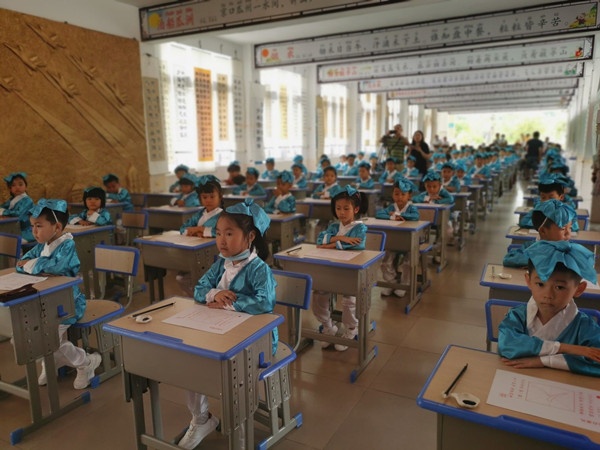 開筆禮,是標志少兒開始識字習禮的一種典禮,是古代讀書人成長過程中的首次大禮,被稱為“人生四大禮”之一。開筆典禮伊始,新生們身著漢服在父母的陪同下就坐,校長吳燕芳作了熱情洋溢的致辭。她先向一年級新生及家長表示最真摯的歡迎和祝賀,殷切希望孩子們可以健康快樂地成長。接著,新生們在禮師的引導下,進行“正衣冠”。“童蒙之學,始于衣冠”新生們一時捋捋頭發,一時拉拉衣角,有的還互相檢查,十分認真。