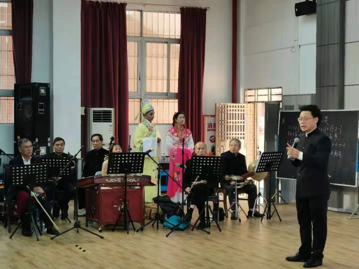 表演過程中,主持人向學生穿插介紹了粵劇唱法上的特點、粵劇特色及在音樂上的種類。普及知識的同時,主持人還邀請學生上臺體驗,學唱《今日大家開心笑》,歡樂的笑聲溢滿整個校園。臺下的學生也忍不住手舞足蹈跟著吟唱。