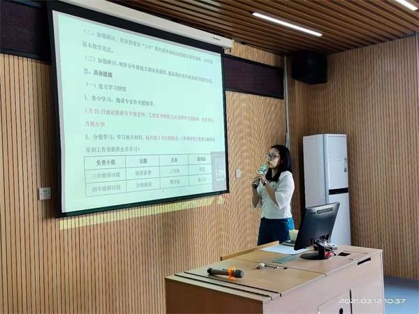 會(huì)議開(kāi)始,主持人朱殷沂老師對(duì)本年度工作室的工作計(jì)劃進(jìn)行了詳細(xì)的解讀。朱老師針對(duì)本鎮(zhèn)英語(yǔ)閱讀教學(xué)的具體情況,對(duì)工作室的成員進(jìn)行了具體詳細(xì)的分工,初步探索“1+N”課內(nèi)與課外相結(jié)合的閱讀教學(xué)策略,提高課內(nèi)與課外閱讀教學(xué)的結(jié)合度,其中提到要建立年級(jí)研討小組并且成立實(shí)驗(yàn)班,對(duì)學(xué)生情況進(jìn)行摸底檢測(cè)。