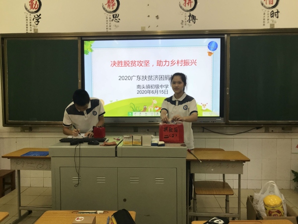 每年的6月30日是“廣東扶貧濟困日”。所募集款物重點用于幫扶我省建檔立卡的相對貧困村、貧困人口脫貧奔康。結合“博愛、創新、包容、和諧”的新時期中山人精神和全民修身行動,伸出溫暖的雙手,奉獻真摯的情誼,積極參與,各盡所能,群策群力幫助貧困地區、貧困群眾早日脫貧致富,讓弱勢群體過上幸福美好的生活。因此,南頭鎮初級中學廣泛發動了全校學生積極參與本次捐款活動,為困難群體提供人道援助,營造互幫互助互愛的良好社會氛圍,傳承博愛人道精神。自本次活動發出倡議后,同學們積極參與,學校倡議以“自愿奉獻”為原則,希望同學們用平時攢下來的零用錢來參加本次的濟困活動。