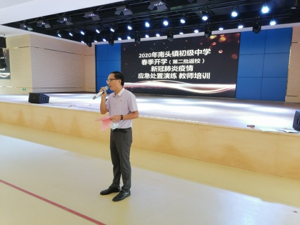 在第一批高三、初三學生順利返校,以及第二批師生核酸檢測完成的前提下,5月11日,中山市高一、高二,初一、初二學生返校,南頭鎮初級中學第二批教師于5月6日返校進行工作準備。2020年5月6日上午,南頭鎮初級中學開展第二批返校教師疫情防控培訓,初一、初二級全體教師參加培訓,培訓由毛賢偉副校長主持。