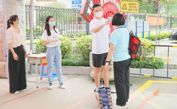 第一天的工作顯得尤其重要,所有班主任早早進入教室,迎接久別的孩子。雖然是錯峰返校,人員不密集,但是大家對安全一刻沒有放松。為了減少學生與外來人員接觸的機會,按照上級統一部署要求,首先要把好進校門第一關。相關老師和工作人員都按照規定提前到崗,履行職責。學生抵達學校后,除學生本人可以進入校園外,學生家長、其他同行人員、車輛均不得進入校園。所有沒有課的老師配合保安人員維持現場秩序,確保每個學生間隔一米排隊等候。學生出示健康碼,佩戴好口罩才能進入校園,保安人員對學生進行了嚴格的體溫檢測,噴灑免洗洗手液,嚴格把好進門關。學生中有帶行李和文具的,將行李和文具放置在設定的消毒區域,由工作人員對其進行消殺后,學生方可攜帶行李進入校園。默契的配合,一切都顯得那么自然而溫馨,疫情無情,校園有愛……