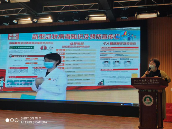 本次培訓,首先由中山市疾控中心王曼主任給大家授課,她在視頻中詳細講解了新冠肺炎基本知識,讓大家學會了如何避免被傳染的風險,防止自己成為續發病例。接下來,由中山市疾控中山朱亞陽主任給大家進行了知識的拓展和補充講解,朱主任針對疫情,講授了學校防控新冠肺炎工作中不同場所清潔消毒的正確方法,以及防護用品正確的穿戴方法和和如何科學洗手。
