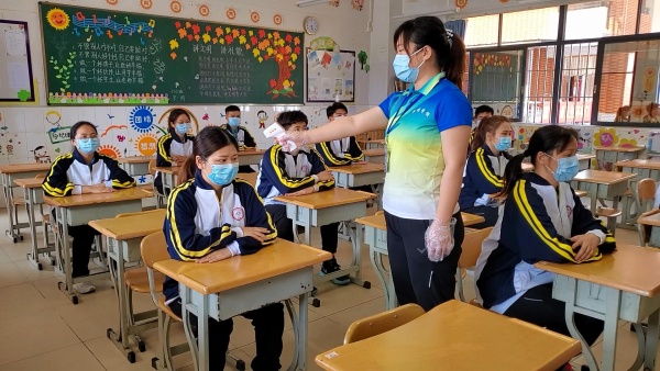 情境一,學生按年級,分時段,按指定路線進校園晨檢。保安在門口維持秩序,學生間隔一米排隊進校,值周行政、值周教師在校門口有序引導學生測體溫。發現某生體溫高于37.3℃,交由校保健老師引導到臨觀室撫慰、復核,盡力避免孩子緊張恐懼。確定是發燒癥狀,按規定流程處置。