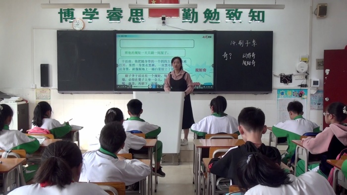 課堂伊始,蔡老師用名片激發(fā)學(xué)生的學(xué)習(xí)興趣,同時利用有趣的肢體動作演示幫助學(xué)生理解刷子李刷墻時的動作,引導(dǎo)學(xué)生理解他的技藝高超。學(xué)生在輕松、有趣的環(huán)境中學(xué)習(xí)《刷子李》這一課,朗朗的書聲此起彼伏,課堂氛圍十分活躍。