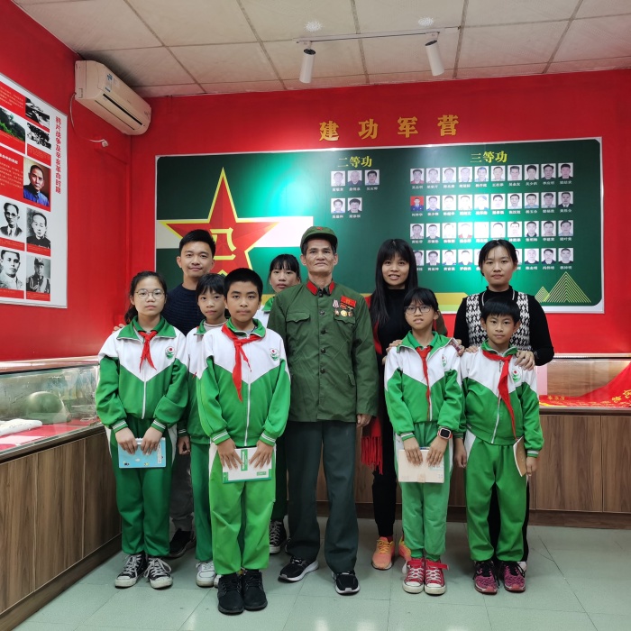 12月10日下午,三角鎮中心小學五1班學生代表在德育副主任吳科桂老師、少先大隊輔導員周文彪老師、五1班班主任蔡靜蕓老師、三角鎮中心小學班主任工作室主持人黃寶盈老師、工作室成員張善凡老師的帶領下,來到了三角鎮退役軍人服務中心,孩子們聆聽了在越南戰爭中立下偉大功績的老兵吳金友爺爺講述了他的戰斗故事。孩子們一個個聽得專心致志,被吳爺爺的英勇事跡深深地打動了,臉上情不自禁地流露出自豪的神情。