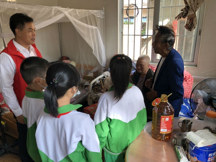 隨后在學校少先隊大隊部的組織下,結民村團支部書記吳飛寶、結民村民政助理楊順昌、學校吳博事校長、段美娟副校長和大隊輔導員周文彪老師,帶領少先隊志愿者們,走進了老人的家開展了愛心慰問活動。活動中各中隊少先隊志愿者代表熱情地與爺爺奶奶們交談,給他們送上了面條、花生油和慰問金,并祝愿他們健康長壽。爺爺奶奶們一個個神采奕奕,高興不已,臉上露出了幸福的笑容。活動在愉快的氣氛中順利結束。