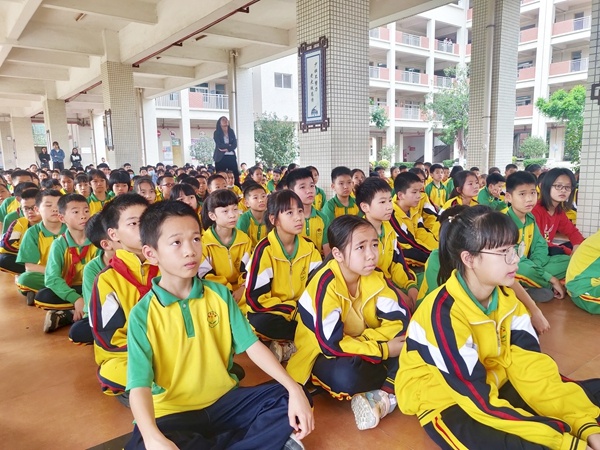 德育處副主任黃潔玉老師首先指出五、六年級學生近階段來存在的一些問題和不良現象,并對這些問題和不良現象進行分析總結、批評指正。黃主任要求同學們做到早上按時進行早讀,課間不能在教室和走廊追逐奔跑,中午吃完飯11:30-11:50以及午睡完13:30-13:50這兩段時間不在校園到處奔跑追逐、甚至玩危險的游戲,講究文明上廁所、文明使用飲水機,不帶錢、手機、零食回來學校,未經學校許可不能騎自行車到學校。