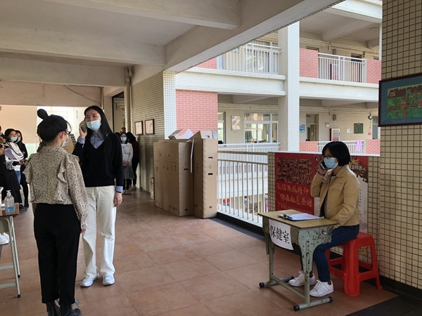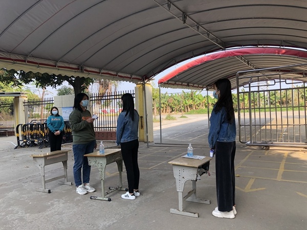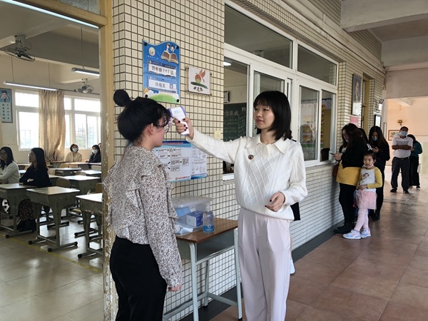 把好入校安全關。參與演練的教師模擬“學生”,在東校門外每人間隔1米站隊,依次踏著消毒地毯進入校門,值日老師進行體溫測量,噴免洗洗手消毒液消毒雙手。對于體溫異常的學生,值日老師通知值日行政,值日行政安排學生到臨時觀察室等候,并通知校醫對學生進行水銀溫度計進行二次測溫,詢問相關情況。