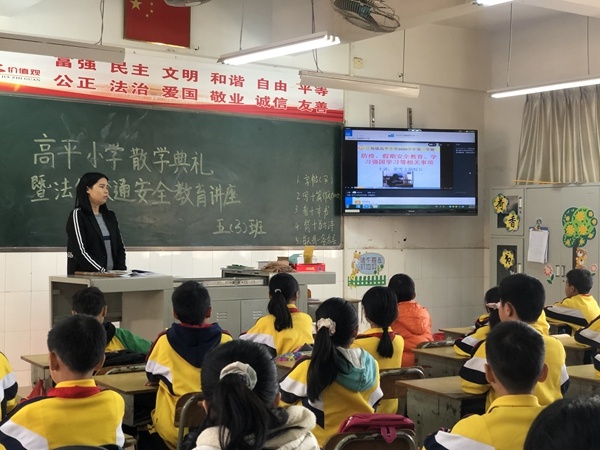 此次散學典禮,由高平小學德育處黃潔玉副主任主持。典禮在莊嚴而肅穆的升旗儀式中拉開序幕。為提高學生假期的法制、交通安全防范意識,高平小學法制副校長關松堅同志作法制知識講座,劉校長結合形象生動的實例,深入淺出地為同學們傳授法制安全小常識,提醒同學們要提高法制意識,學會用法律保護自己,做知法懂法守法的小公民,與法同行,防微杜漸。然后,三角鎮交警大隊杜友明警官作交通安全宣傳講座。馮警官用通俗易懂的話語和典型的事故案例,為學生敲響警鐘,提醒他們始終將交通安全牢記于心,實踐于行,切實提高防范意識,杜絕交通事故的發生。