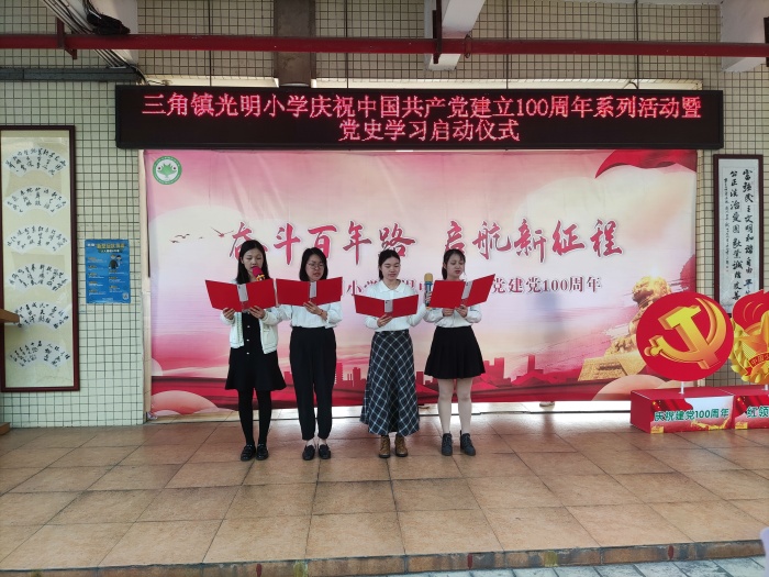 為隆重慶祝中國共產黨成立100周年,回顧黨的光輝歷程,謳歌黨的豐功偉績,唱響共產黨好、社會主義好、改革開放好、偉大祖國好的主旋律,進一步激發全校師生的歷史責任感、使命感和榮譽感,從而更加堅定理想信念、堅信黨的領導。3月10日上午,光明小學精心籌劃并舉行了慶祝中國共產黨建黨100周年暨紅領巾爭章活動啟動儀式,活動儀式由副校長黃麗娟主持,全體師生參加了儀式。