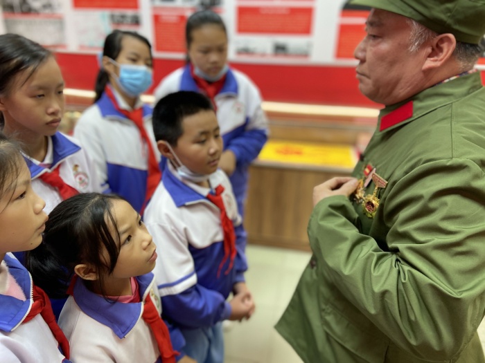 參加活動的少先隊隊員們首先來到了三角鎮退役軍人服務中心,隊員們聆聽了在越南戰爭中立下偉大功績的老兵翁錦泉爺爺講述的戰斗故事。孩子們一個個聽得專心致志,被吳爺爺的英勇事跡深深地感動了,心中肅然起敬,臉上情不自禁地流露出自豪的神情。