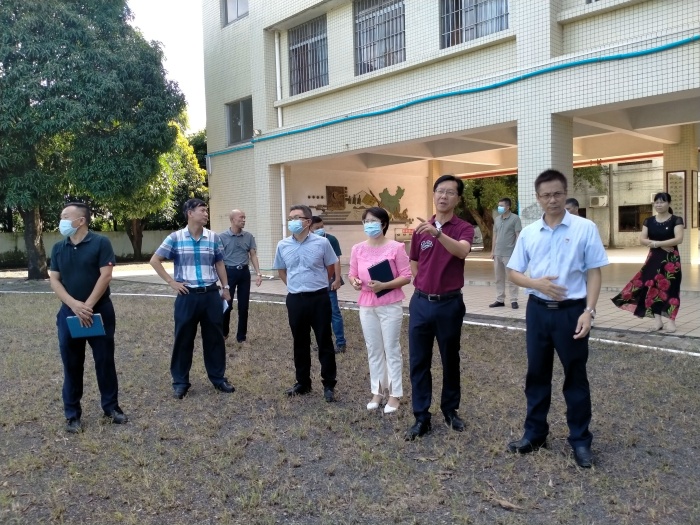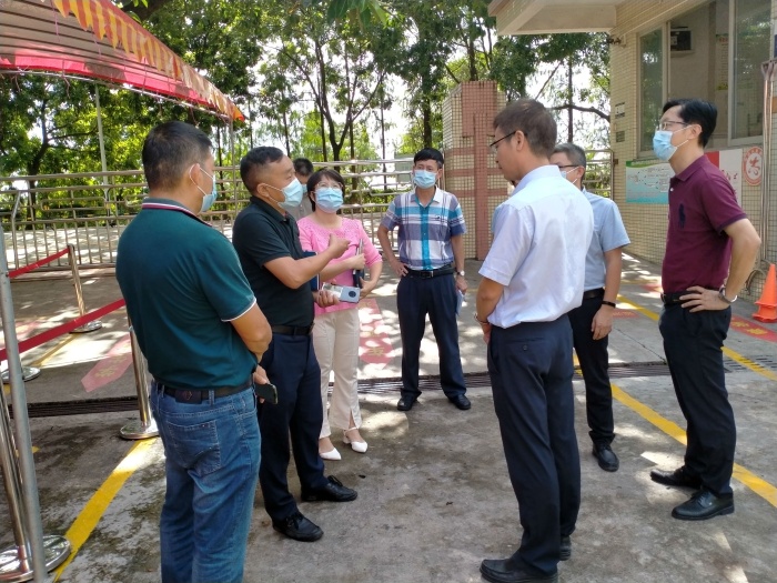 調研組在學校行政的陪同下巡視校園環境,細心詢問學校新學期防控工作落實情況,實地查看了學校運動場、校園文化、教師辦公室、教室教學設備等。